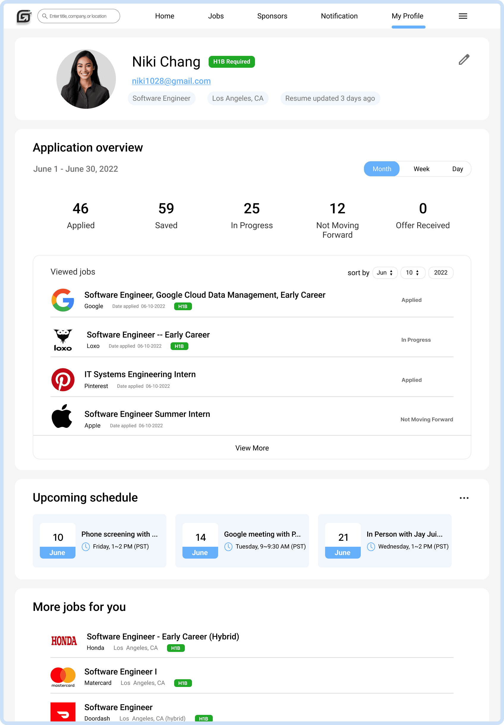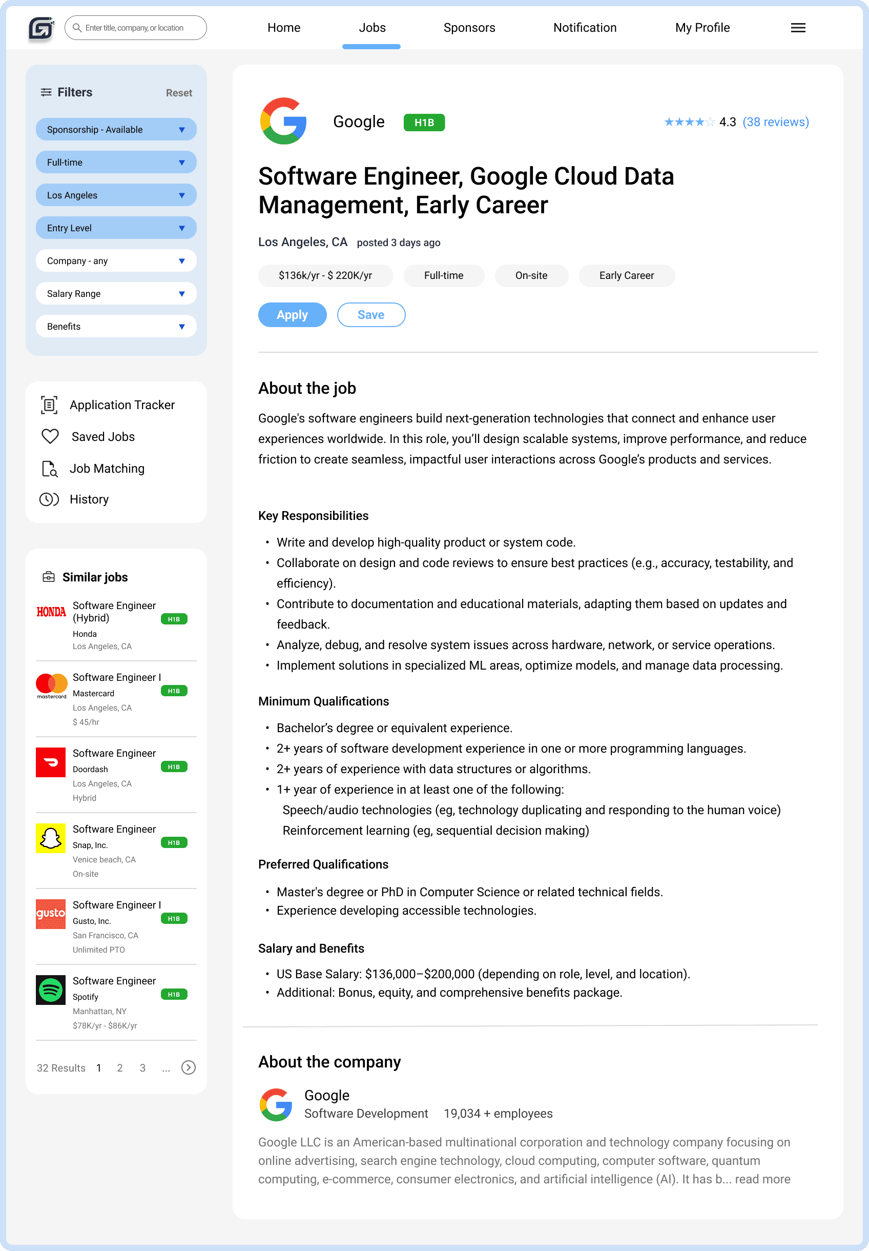 Clean, modern layout with additional features –To better serve our young, savvy users, we created a more modern, balanced layout with clearer hierarchy, added quick-access actions to streamline key tasks, and surfaced highlights like the H1B sponsorship badge for faster eligibility checks.
