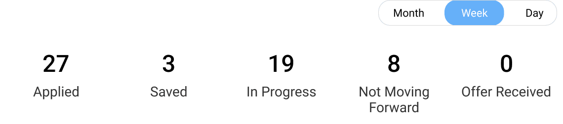 Application Overview Dashboard — Delivered a clear summary with month, week, and day views, helping users quickly grasp their job search status.
